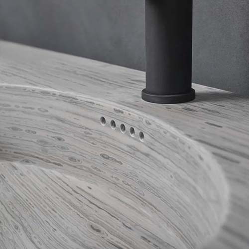 Homogent kompositmaterial, bestående av en unik blandning av akryl, polyester och aluminiumspulver (ATH). Solid Yta är mycket slitstarkt, lätt att rengöra och har en vacker sidenmatt bakterieresistent yta. Rengörs med vanliga rengöringsmedel. Tål milda avkalkningsmedel och kräver ingen särskild underhåll. Kalkavlagringar avlägsnas med t.ex. hushållsvinäger. Skölj därefter området med varmt vatten. Torka och behandla med Marmorline Vårdvax.